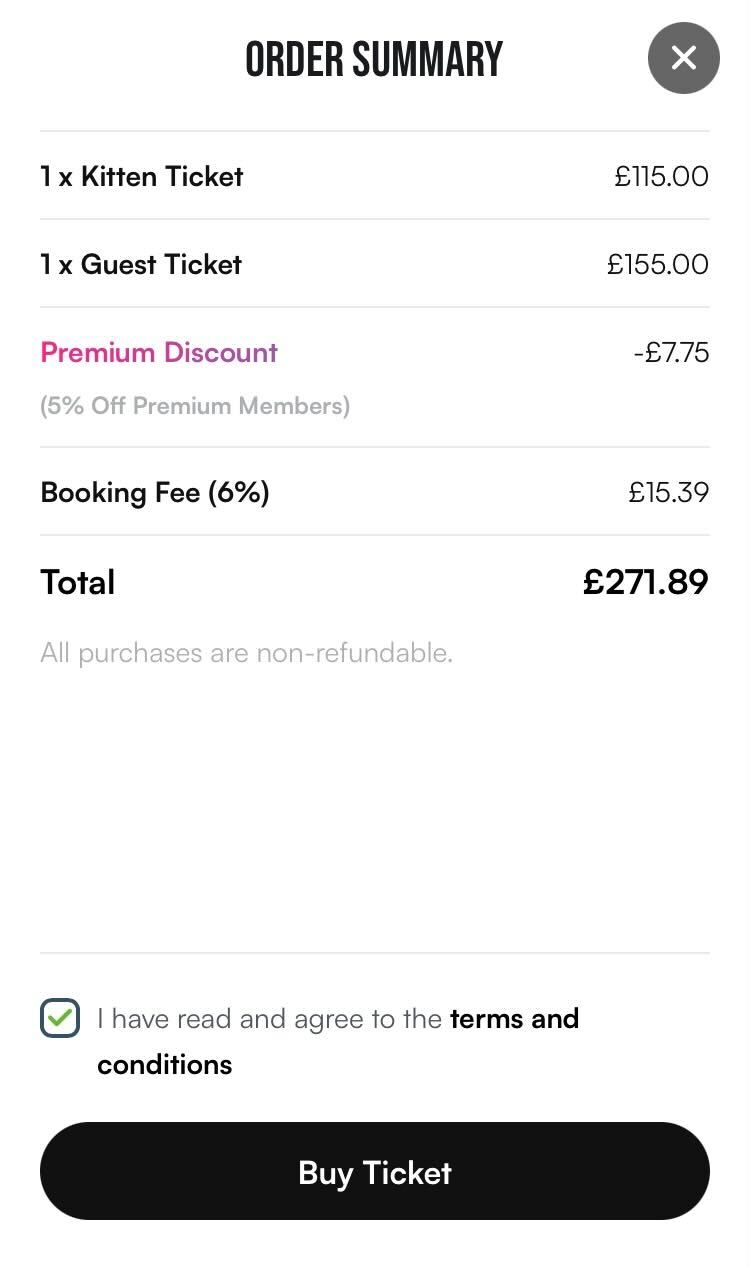 Select your ticket type: "Kitten Ticket" if attending alone, or select a “Kitten Ticket” and a "Guest ticket" if attending as a couple or you wish to bring a guest member. Click "Buy now".